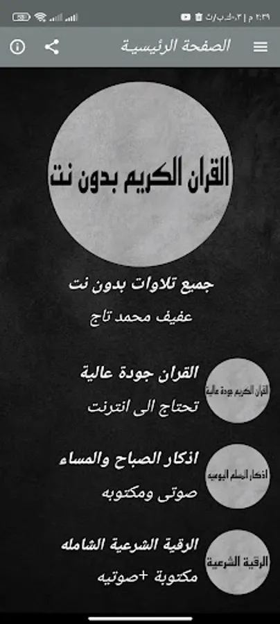 The recited Qur’an with the voice of the reciter Afif Muhammad Taj without the net, high quality mp3. The application of Sheikh Afif Muhammad Taj is a distinguished application that includes all the readings of the sheikh without the net. Including an audio clip that includes all the supplications that are said after and before the prayer, while walking and leaving the house, and other things that the Muslim must know about.