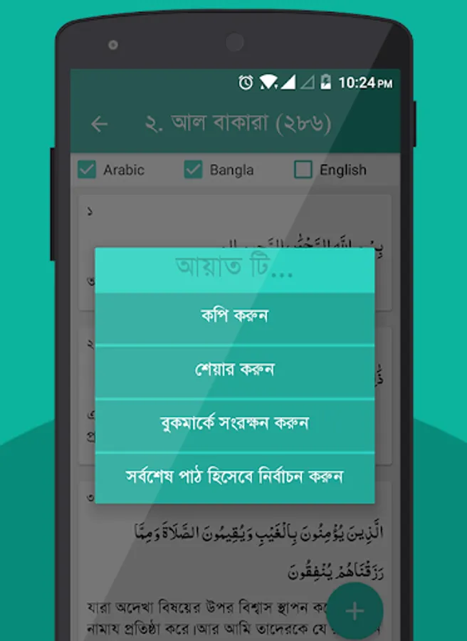 B: DR: - Reading Arabic Quran in Bengali is more likely to cause sin (sin) instead of Swab, Tajzid is not properly observed when reading the Qur'an in Bengali pronunciation. That is why this app was not given Bangla accent.
