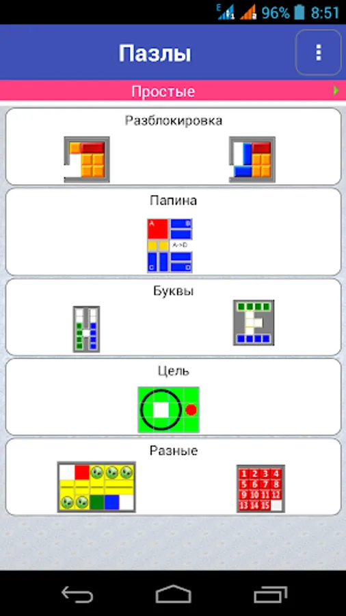 Puzzle sliding blocks. Two difficulty levels, three types of puzzles.