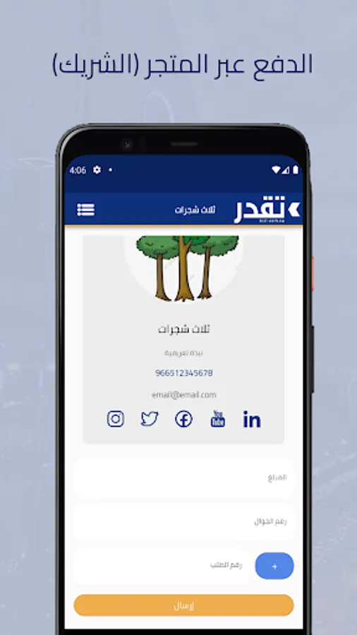 * You can pay in more than one way either from general payment by filling in data (order number “or more than one order number” - amount - store - mobile number) or through the store screen by filling in data (order number “or more than one order number” - Amount - mobile number) and view store information from a website, contact number, e-mail or through social media, and feel how well the store matches your requirements through the store profile.