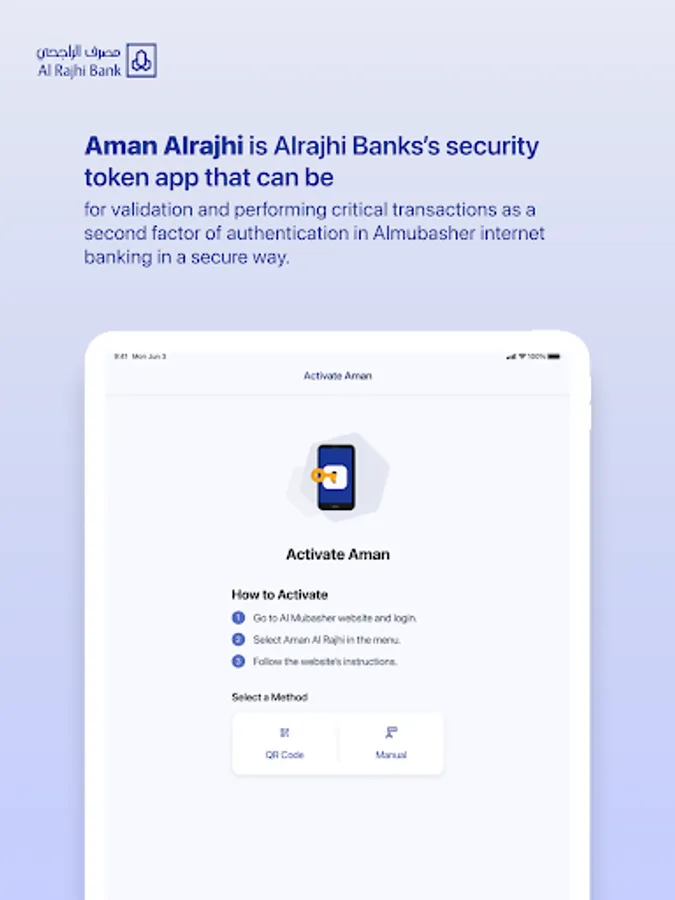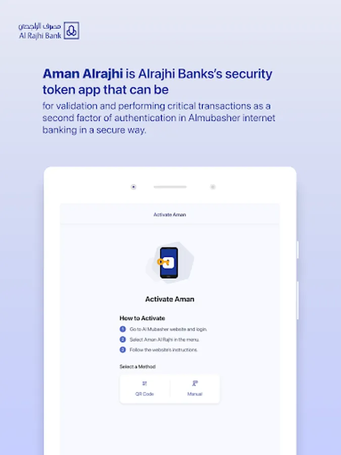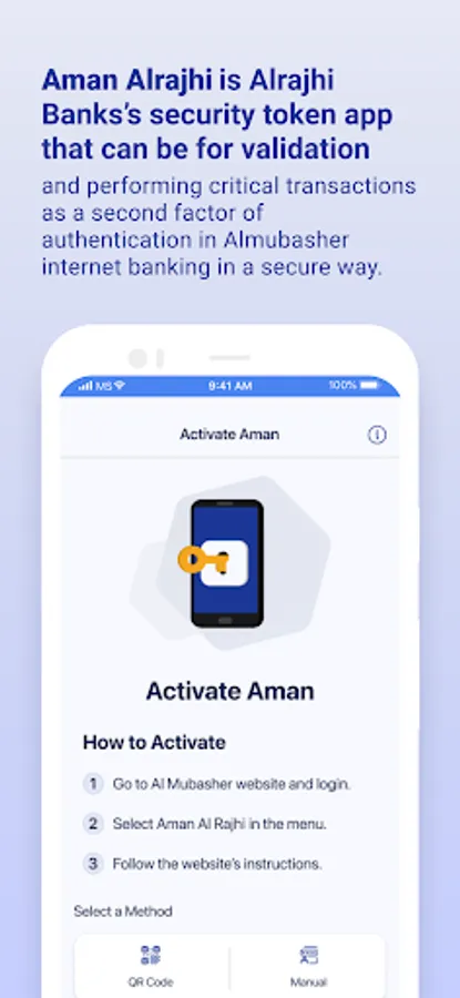 “Aman Al Rajhi” is Al Rajhi Bank’s Security Token App that can be installed on any smart phone for validating and performing critical transactions and operations in Al Mubasher internet banking in a secure way. It is the most efficient method of combating cybercrimes and complies to the online banking regulatory requirements of Saudi Arabia.