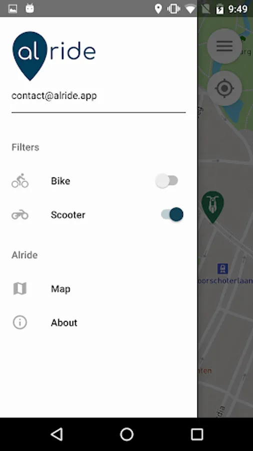 Alride shows you all shared mobility options near you. E-scooters, bikes, electric bikes, mopeds and cars. See them all in an instant with Alride and pick the one you like.