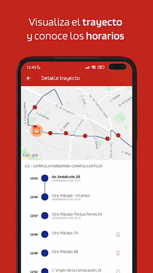 el momento en el que pasa por tu parada y perfecto para que quien te vaya a buscar esté informado del punto de espera con información de StreetView