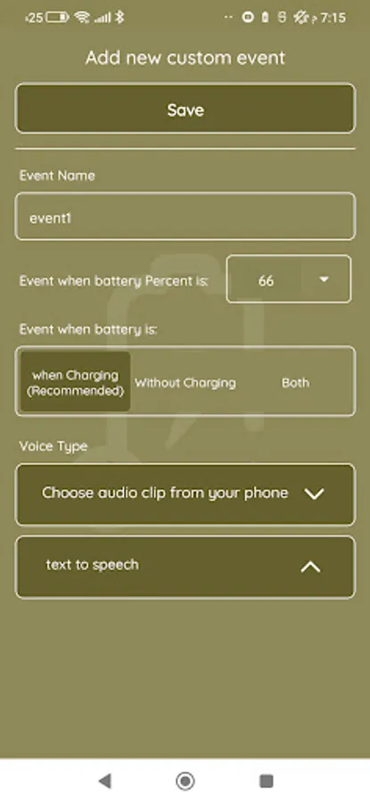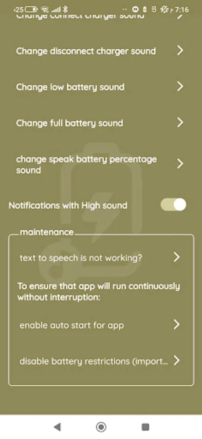 The application is a tool and also an entertainment application at the same time. In general, the application is a tool because it is intended for the reactions resulting from changing the battery status, such as the full battery or the low battery, or connecting the charger to the phone or disconnecting it from it, or even changing the battery charge percentage from one percentage to another and from The most important reactions are when the charger is disconnected, because it informs you that someone has disconnected the charger from your phone when placing it and moving away from it, and also when the battery is full, it makes a sound or says the thing you designated to preserve the battery from leaving the phone on the charger for a long time and thus may damage the battery , and examples of reactions: pronunciation or speaking texts that you can customize for each event separately or even making sounds with audio clips of your own customization as you like, and on the other hand, it is an entertainment application because it contains beautiful audio clips that are released when the charger is connected or disconnected from the phone Also when the phone is fully charged or charging is low.