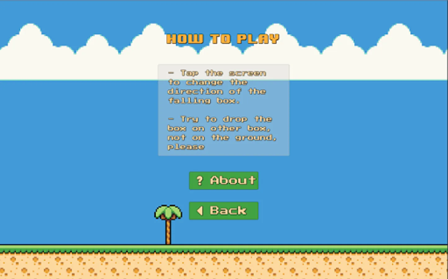 🍁Tap the screen to change the direction of falling box, and try to land them on other box, not the ground and you are good to go.