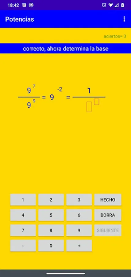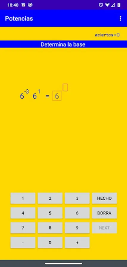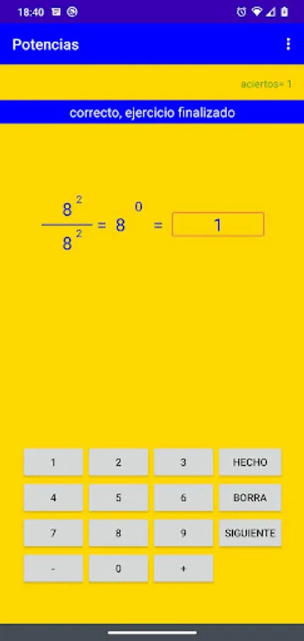 The application generates exercises where the rules of addition and subtraction of powers are applied. It also asks the user to develop negative powers. After 20 exercises the application ends.