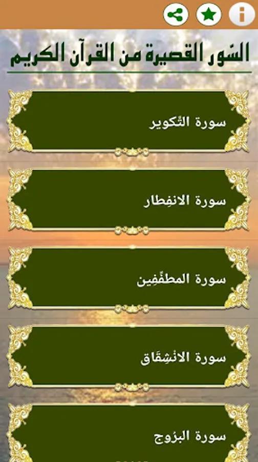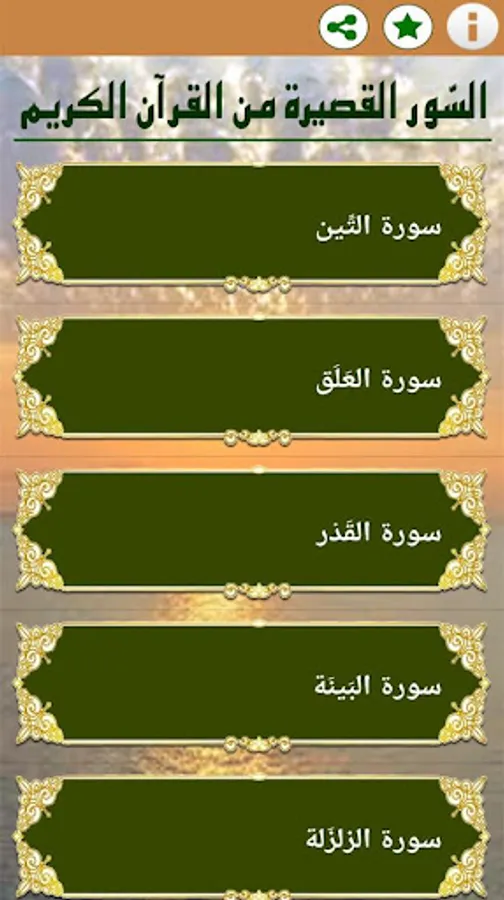Short surahs such as Surat Al-Kawthar, An-Naas, Al-Ikhlas, Al-Shams, Al-Fajr, and others