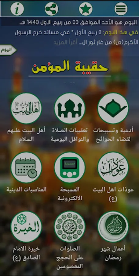 The Shiite Believer Bag is a comprehensive application that keeps you from carrying the book, as it is an electronic booklet that is with you anywhere and anytime. The application is valuable as it contains daily prayer times, complete visits and supplications, prayers and remembrances, supplications that are strongly responsive to needs, supplications of days, the comprehensive Holy Qur’an, daily works and praises For every day, monologues, comments on prayer and supererogatory prayers, the lives of the people of the House, peace be upon them, invocations for the Ahl al-Bayt (peace be upon them), the simple electronic rosary, historical religious occasions, the deeds of the month of Ramadan, prayers on disobedient arguments, the best of Imam al-Sadiq (peace be upon him) and others.