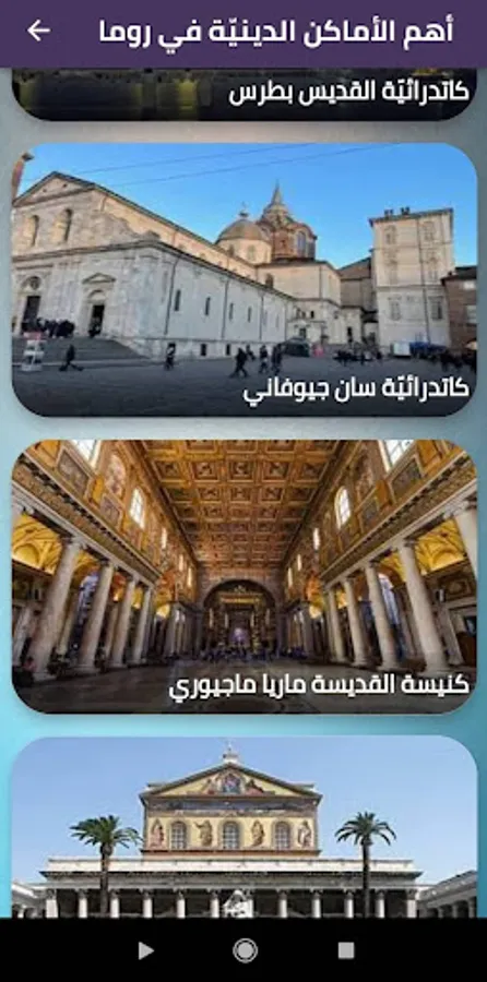 . The most important religious places in Rome: St. Peter's Basilica, the Basilica of San Giovanni, the Church of St. Maria Maggiore, the Church of St. Paul outside the walls, the Church of St. Maria in Cosmedin.