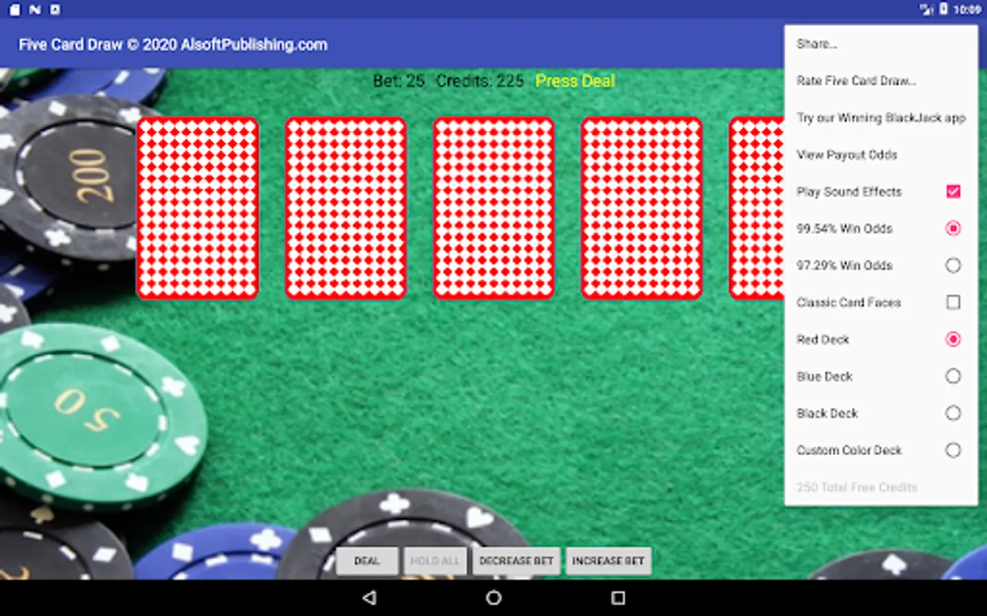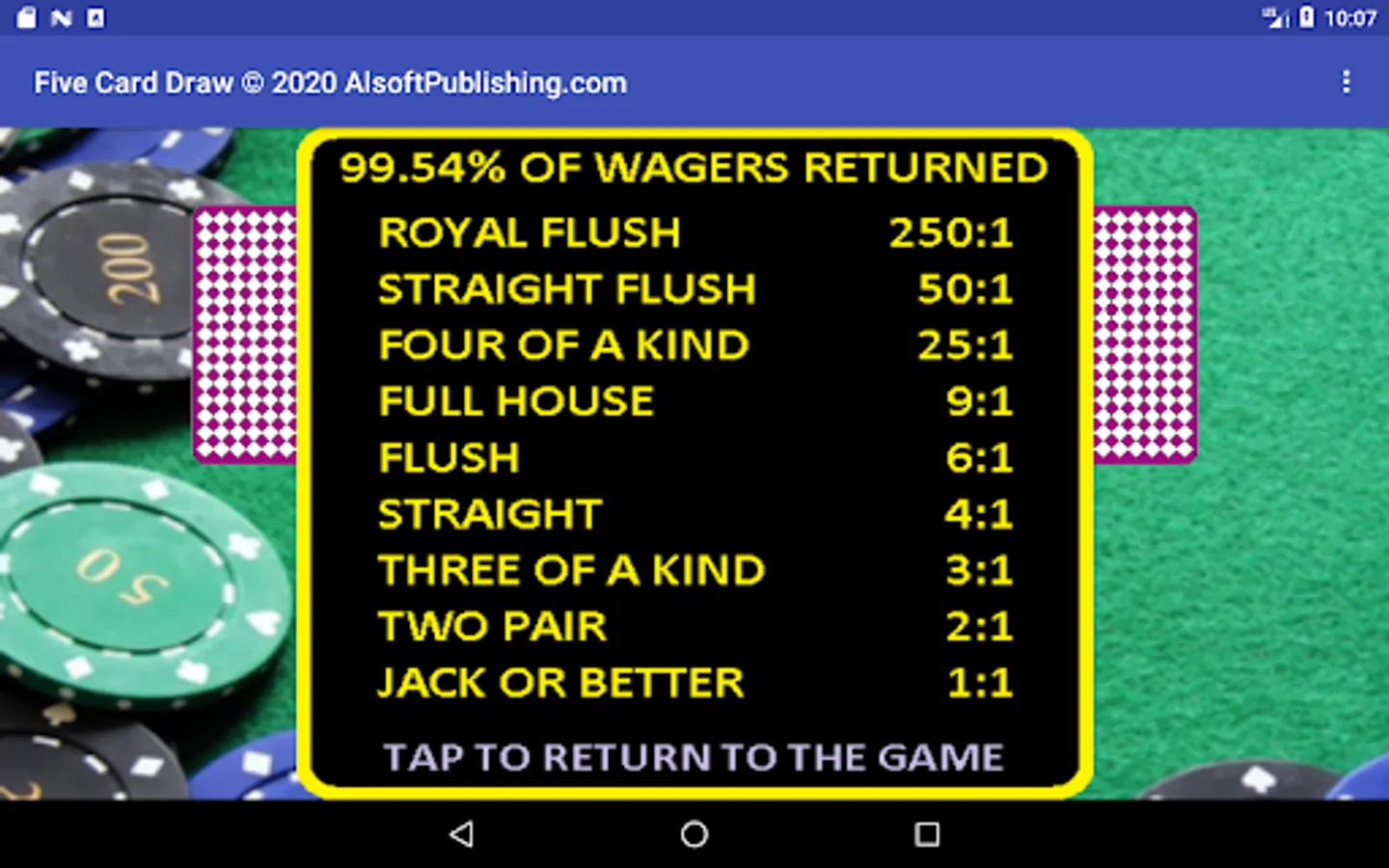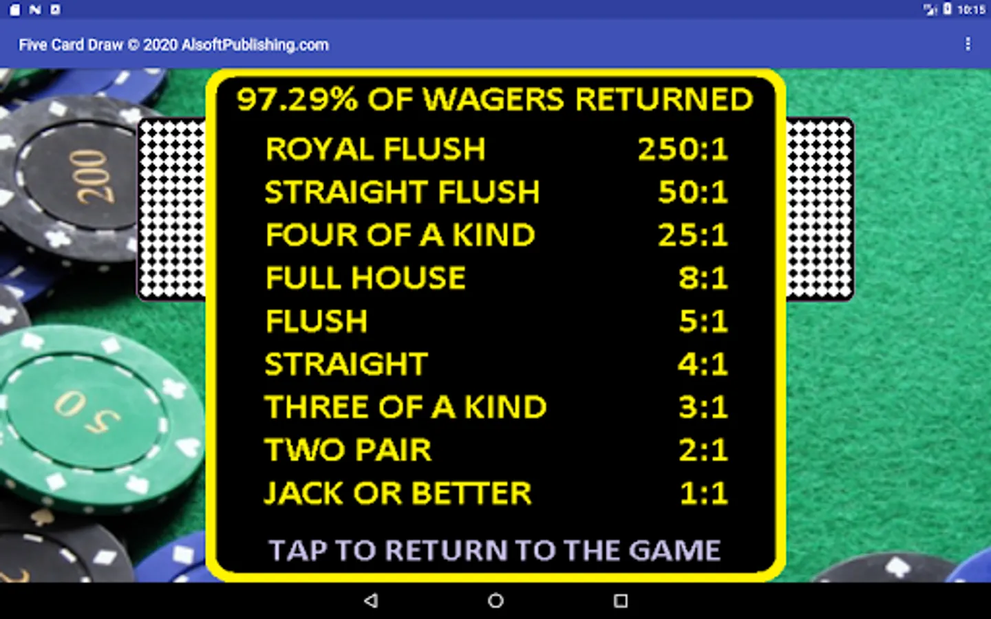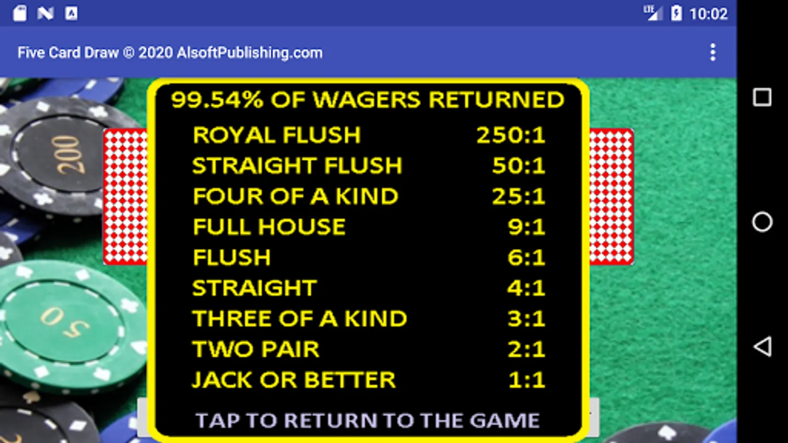 This is a Five Card Draw Poker machine simulator using a 52 card deck with 100% accurate odds. The deck is shuffled prior to each hand to ensure that all cards are available. Wager from 1 to 50 credits. You can select winning odds based on two popular casino payout schemes (1) 99.54% wager return pays 250:1 for Royal Flush, 50:1 for Straight Flush, 25:1 for Four of a Kind, 9:1 for Full House, 6:1 for Flush, 4:1 for Straight, 3:1 for Three of a Kind, 2:1 for Two Pair, and 1:1 for Jacks or Better - OR - (2) 97.29% wager return pays 250:1 for Royal Flush, 50:1 for Straight Flush, 25:1 for Four of a Kind, 8:1 for Full House, 5:1 for Flush, 4:1 for Straight, 3:1 for Three of a Kind, 2:1 for Two Pair, and 1:1 for Jacks or Better. Totally free to play. No in-app purchases and no full screen ads.
