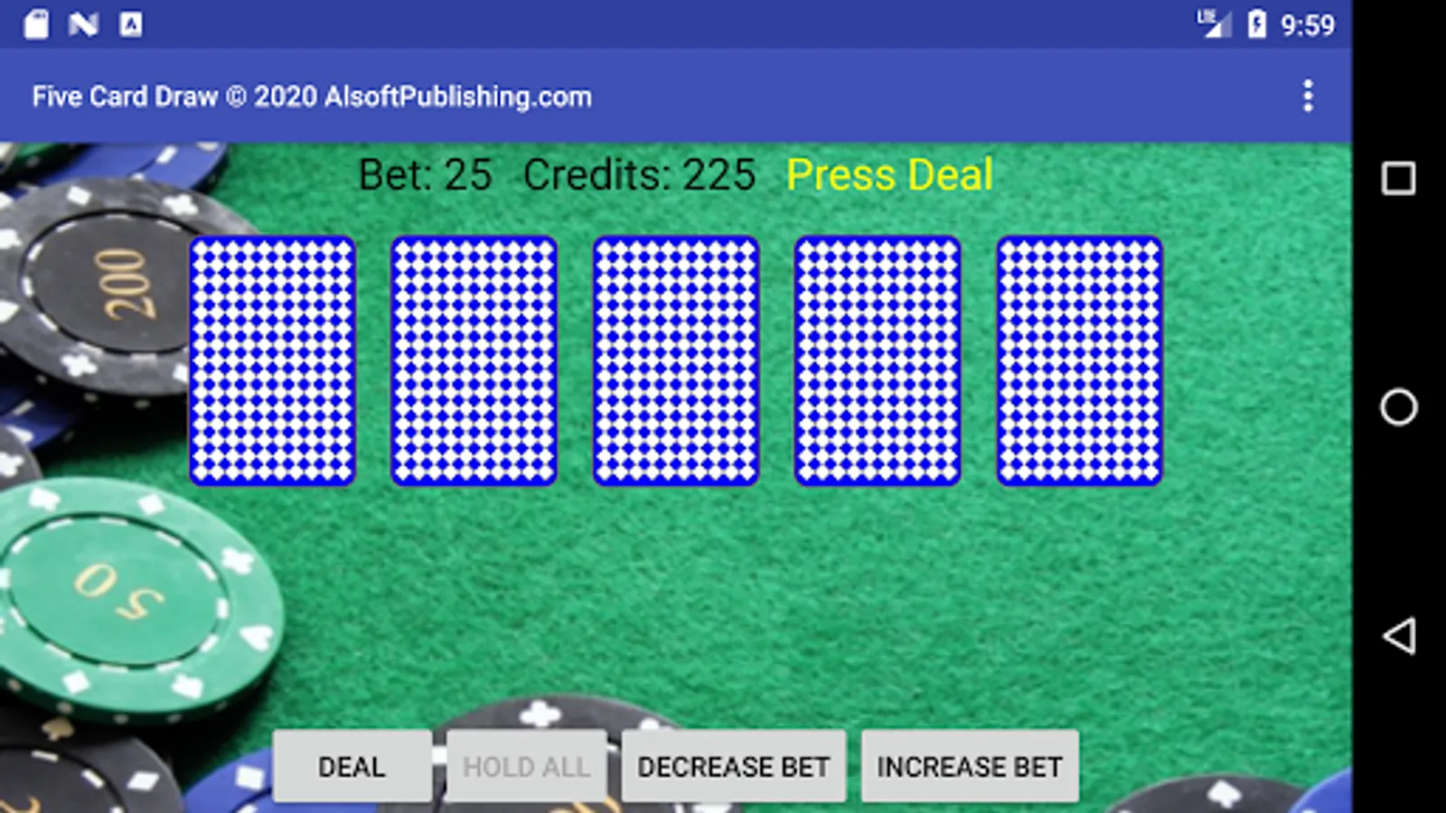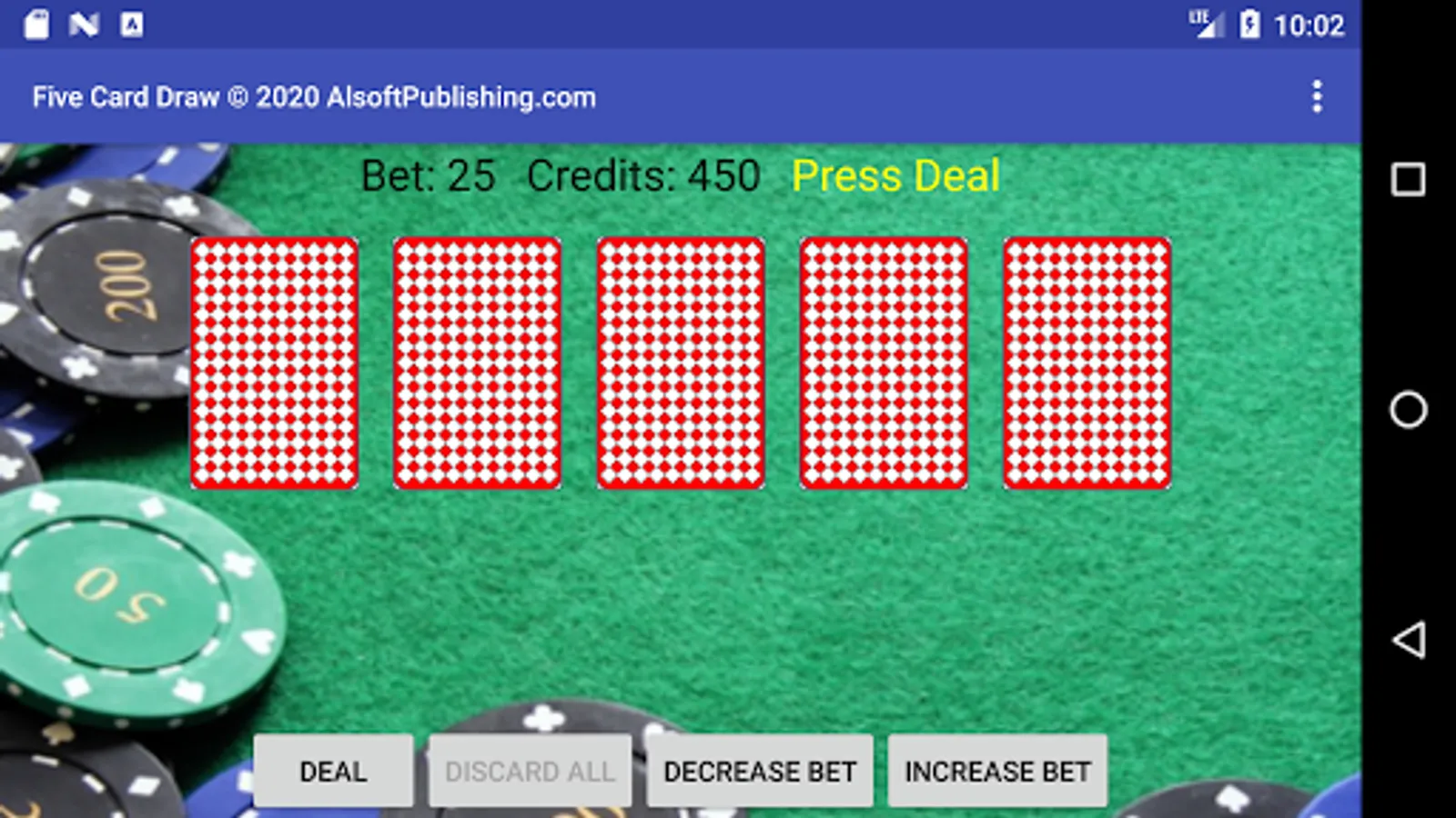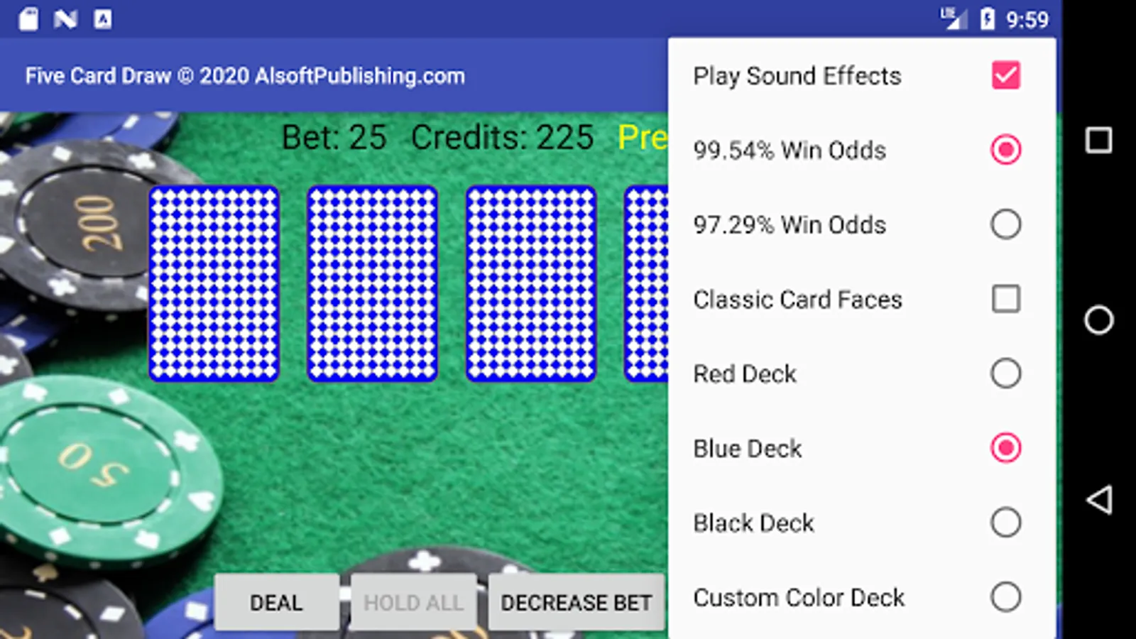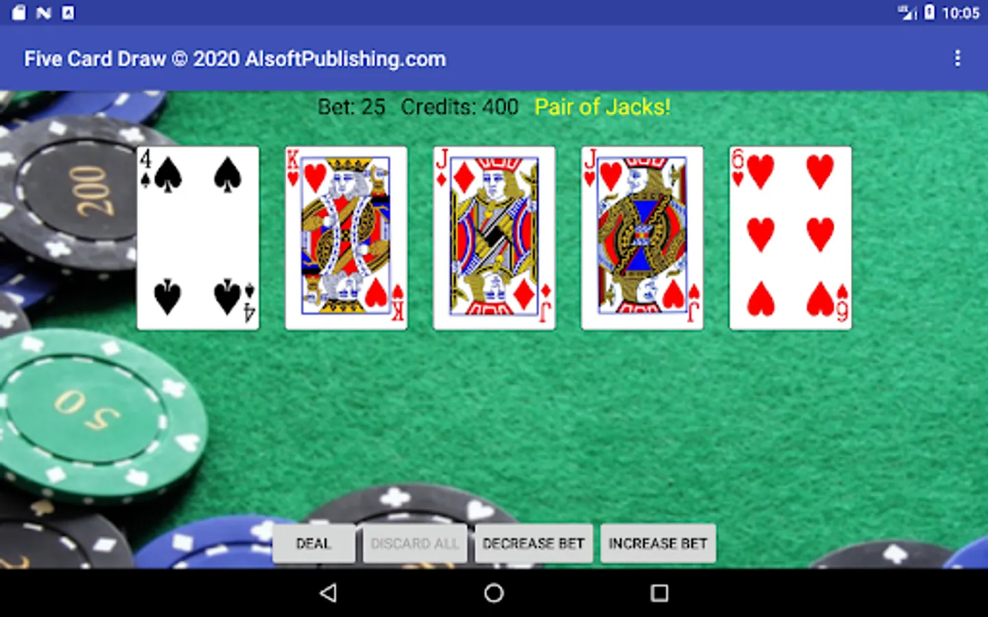 This is a Five Card Draw Poker machine simulator using a 52 card deck with 100% accurate odds. The deck is shuffled prior to each hand to ensure that all cards are available. Wager from 1 to 50 credits. You can select winning odds based on two popular casino payout schemes (1) 99.54% wager return pays 250:1 for Royal Flush, 50:1 for Straight Flush, 25:1 for Four of a Kind, 9:1 for Full House, 6:1 for Flush, 4:1 for Straight, 3:1 for Three of a Kind, 2:1 for Two Pair, and 1:1 for Jacks or Better - OR - (2) 97.29% wager return pays 250:1 for Royal Flush, 50:1 for Straight Flush, 25:1 for Four of a Kind, 8:1 for Full House, 5:1 for Flush, 4:1 for Straight, 3:1 for Three of a Kind, 2:1 for Two Pair, and 1:1 for Jacks or Better. Totally free to play. No in-app purchases and no full screen ads.