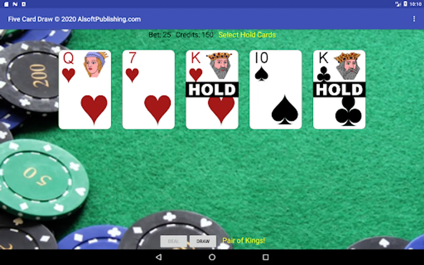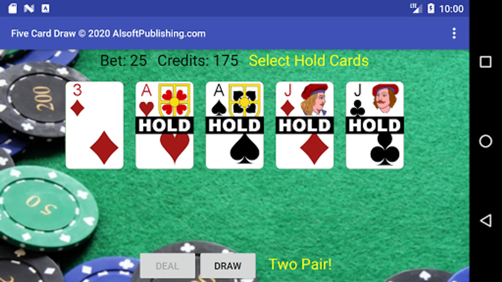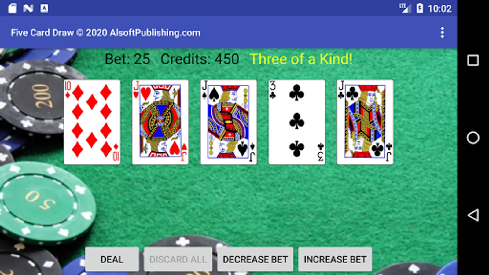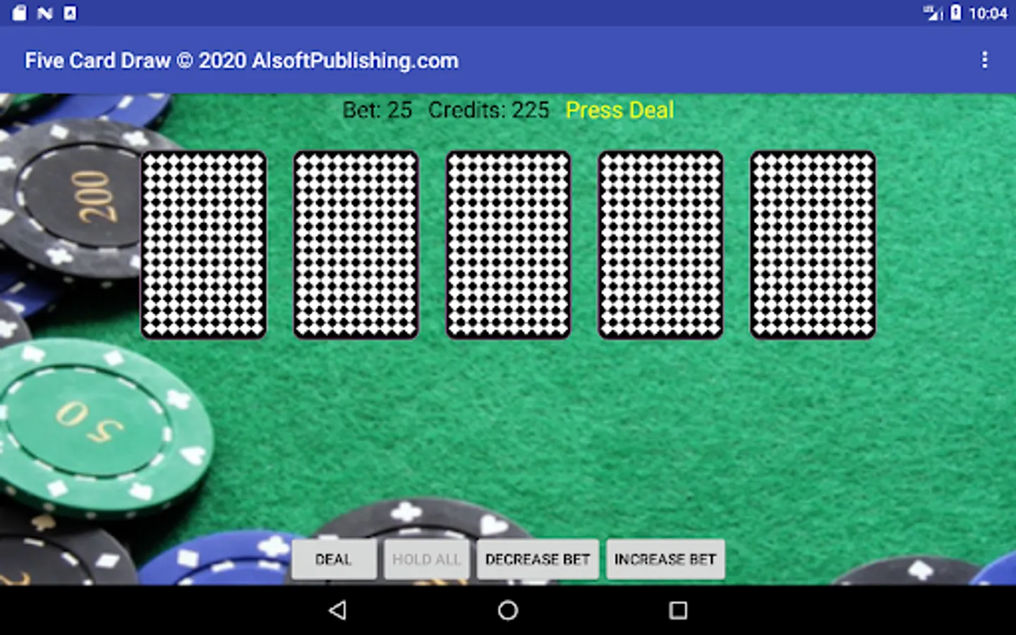 This is a Five Card Draw Poker machine simulator using a 52 card deck with 100% accurate odds. The deck is shuffled prior to each hand to ensure that all cards are available. Wager from 1 to 50 credits. You can select winning odds based on two popular casino payout schemes (1) 99.54% wager return pays 250:1 for Royal Flush, 50:1 for Straight Flush, 25:1 for Four of a Kind, 9:1 for Full House, 6:1 for Flush, 4:1 for Straight, 3:1 for Three of a Kind, 2:1 for Two Pair, and 1:1 for Jacks or Better - OR - (2) 97.29% wager return pays 250:1 for Royal Flush, 50:1 for Straight Flush, 25:1 for Four of a Kind, 8:1 for Full House, 5:1 for Flush, 4:1 for Straight, 3:1 for Three of a Kind, 2:1 for Two Pair, and 1:1 for Jacks or Better. Totally free to play. No in-app purchases and no full screen ads.