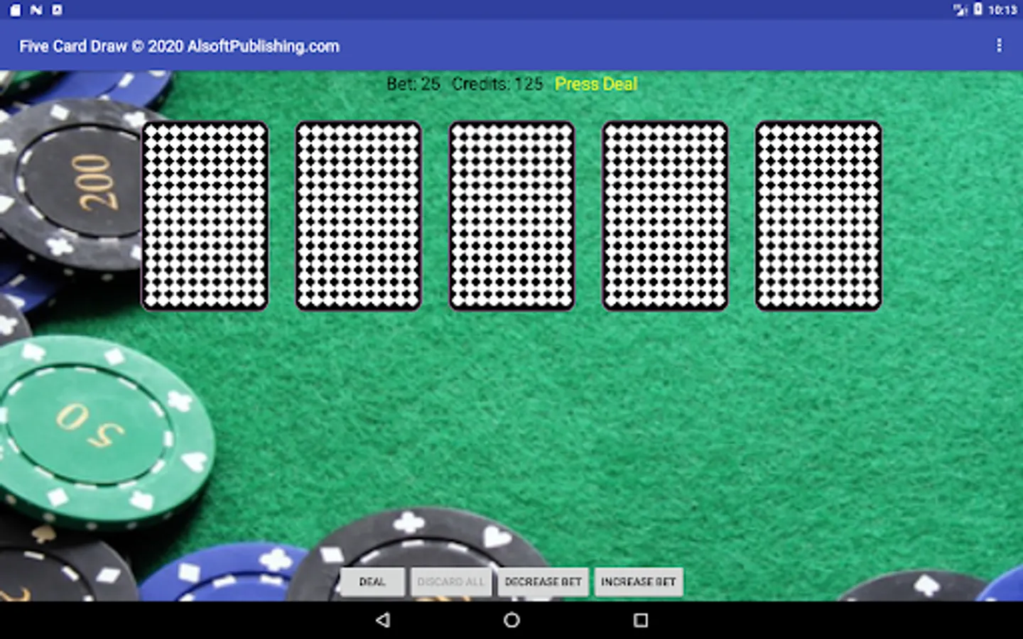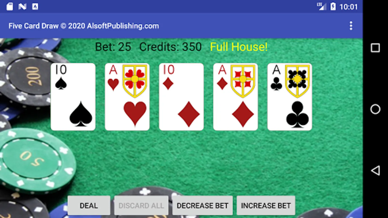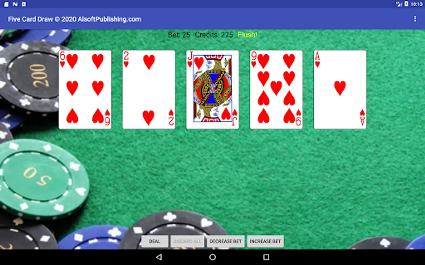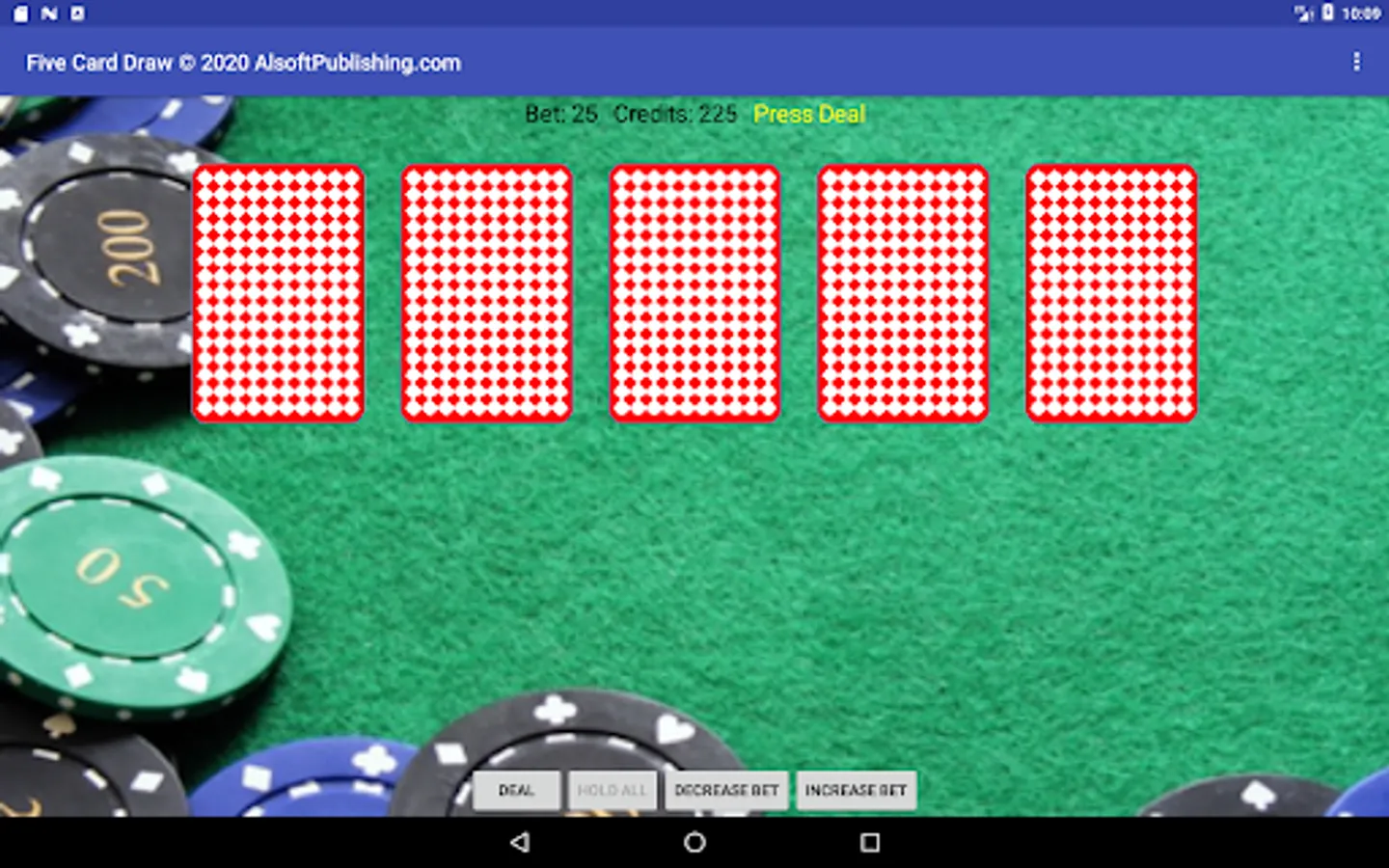 This is a Five Card Draw Poker machine simulator using a 52 card deck with 100% accurate odds. The deck is shuffled prior to each hand to ensure that all cards are available. Wager from 1 to 50 credits. You can select winning odds based on two popular casino payout schemes (1) 99.54% wager return pays 250:1 for Royal Flush, 50:1 for Straight Flush, 25:1 for Four of a Kind, 9:1 for Full House, 6:1 for Flush, 4:1 for Straight, 3:1 for Three of a Kind, 2:1 for Two Pair, and 1:1 for Jacks or Better - OR - (2) 97.29% wager return pays 250:1 for Royal Flush, 50:1 for Straight Flush, 25:1 for Four of a Kind, 8:1 for Full House, 5:1 for Flush, 4:1 for Straight, 3:1 for Three of a Kind, 2:1 for Two Pair, and 1:1 for Jacks or Better. Totally free to play. No in-app purchases and no full screen ads.