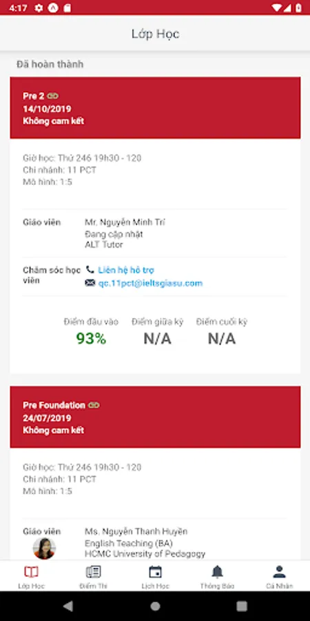 You can check all the information related to your previous and current classes such as tutor profile, Liaison officer, your placement/midterm/final test results, your classmates, and learning calendar with a finger click on your Class. You are also able to find out the start dates of your upcoming courses to arrange your personal calendar with more flexibility.