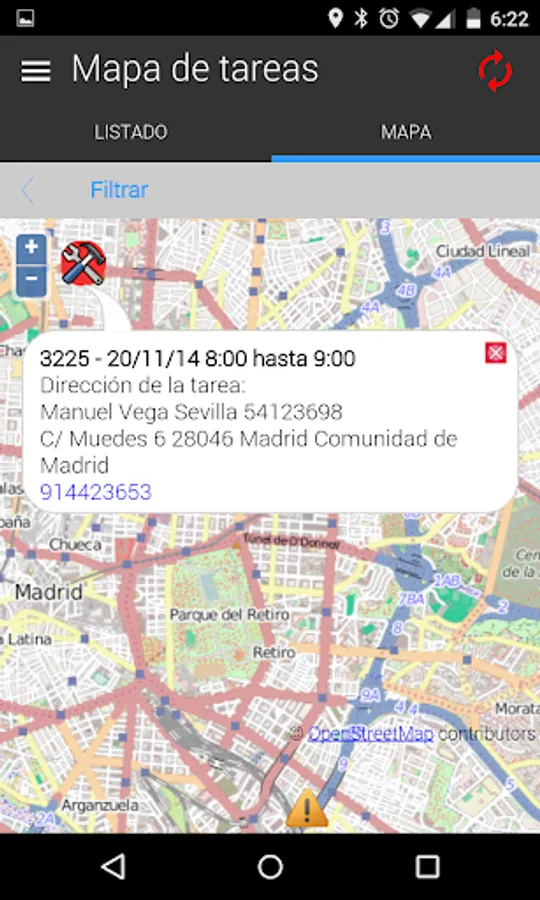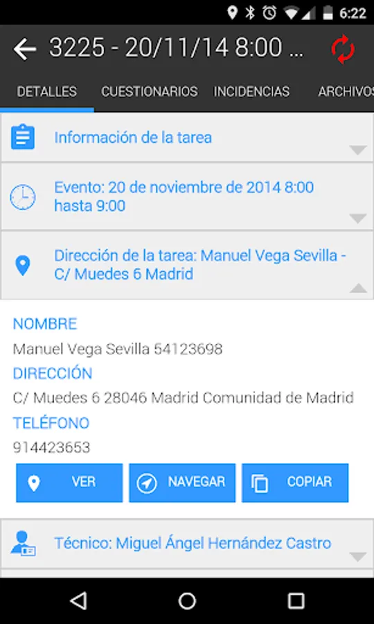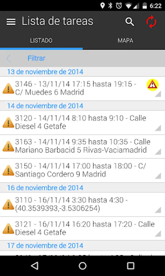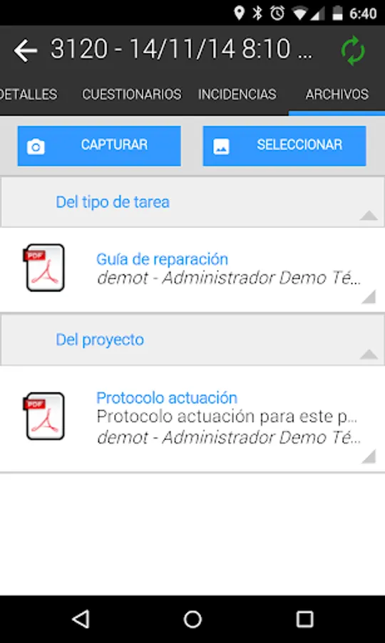 In the mobile application, the worker can see the information of their pending tasks, locate their location on a map, use the GPS to go to their destinations, report the realization of each of them, register incidents, get in touch with other employees or upload files and photos.