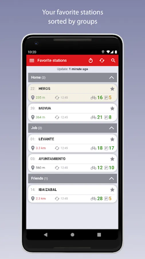 - List of favorite stations categorized by groups (home, work, friends or general).