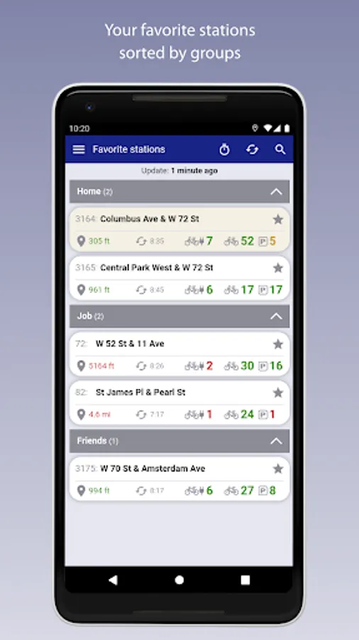 - List of favorite stations categorized by groups (home, work, friends or general).
