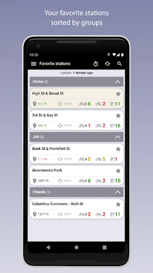 - List of favorite stations categorized by groups (home, work, friends or general).