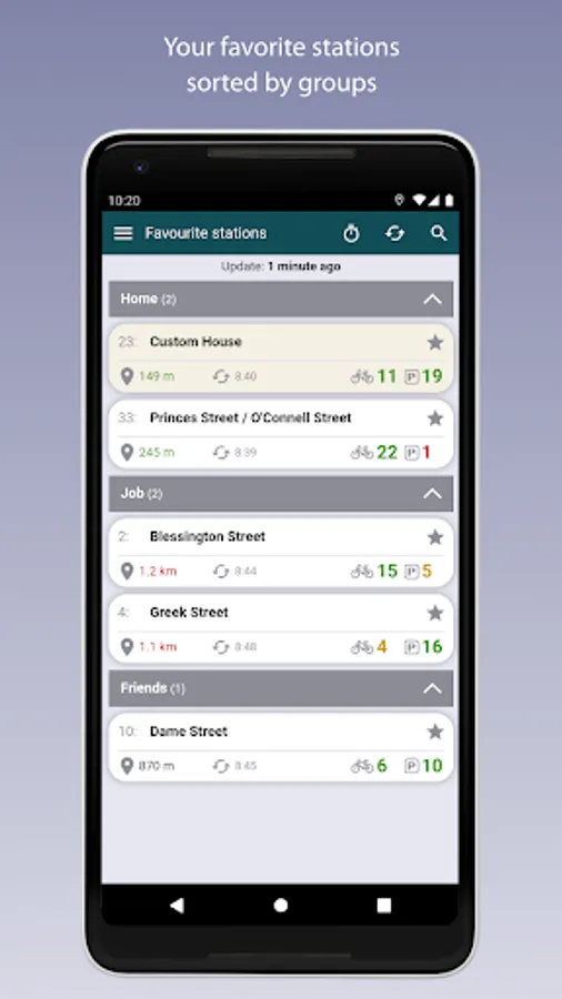 - List of favorite stations categorized by groups (home, work, friends or general).
