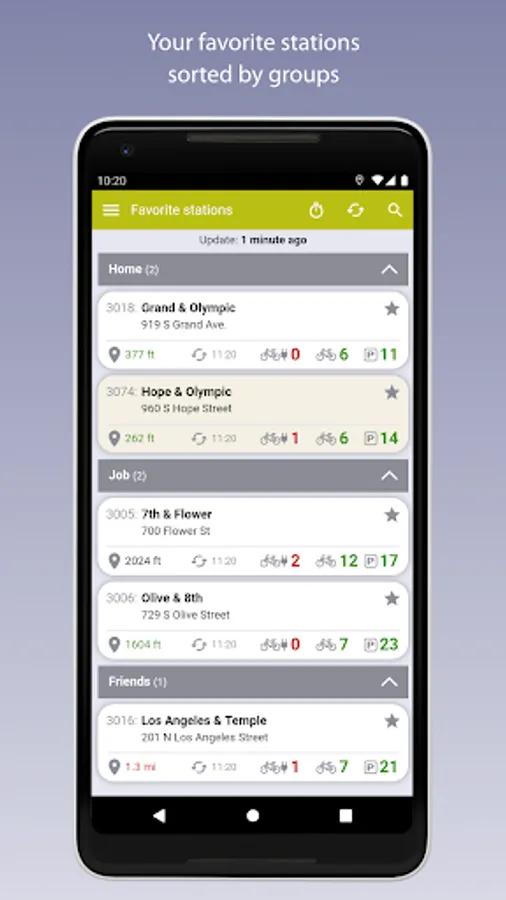 - List of favorite stations categorized by groups (home, work, friends or general).