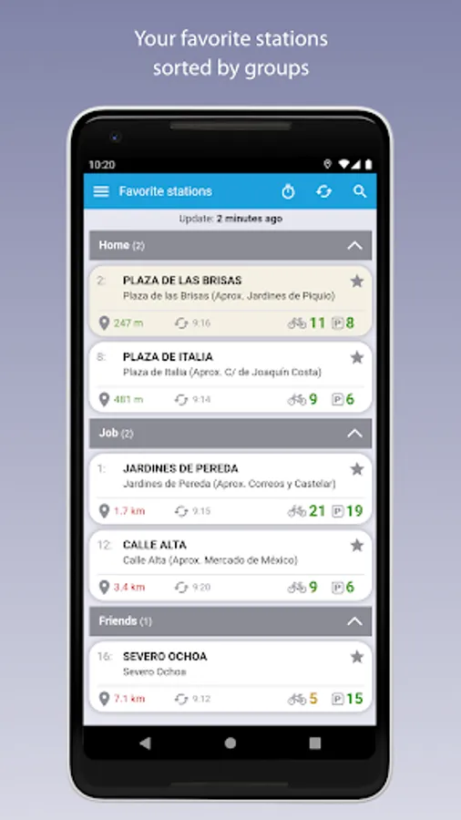 - List of favorite stations categorized by groups (home, work, friends or general).