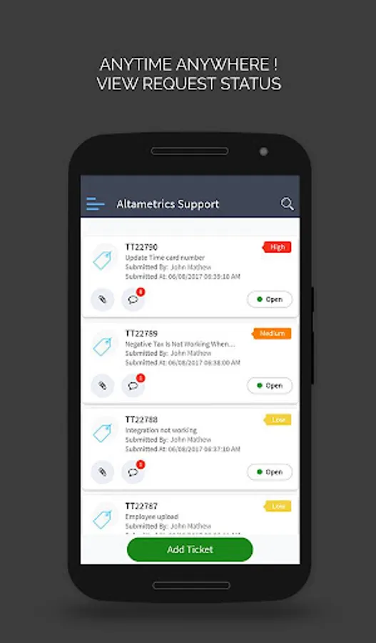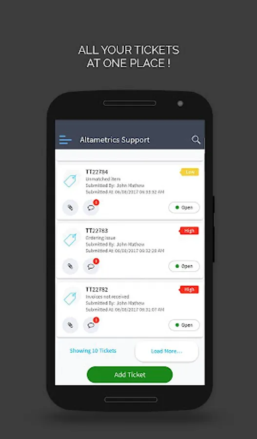 This app enables the user to create a ticket for Altametrics product on the go eliminating the need of sending a mail for submitting a support request. This app also allows tracking the status of the tickets and the relevant details.