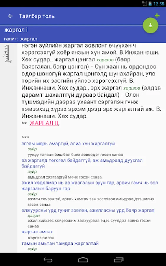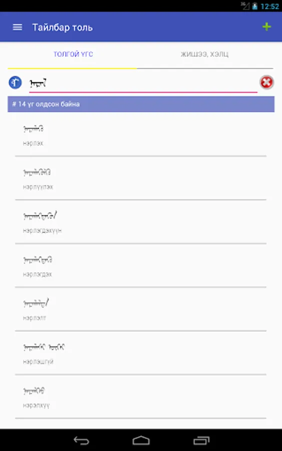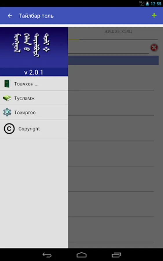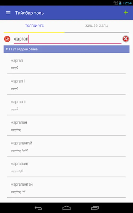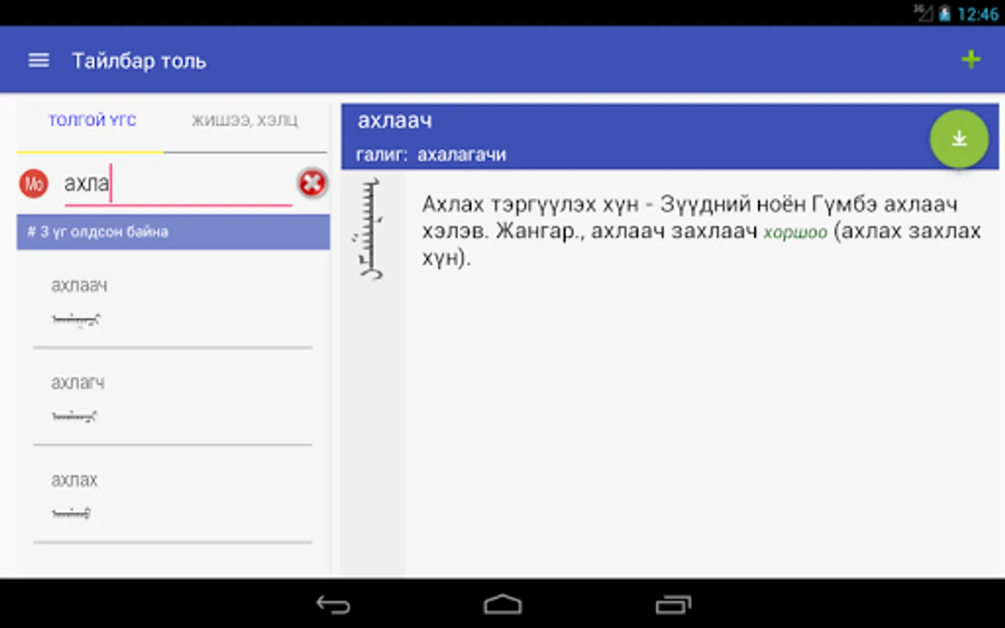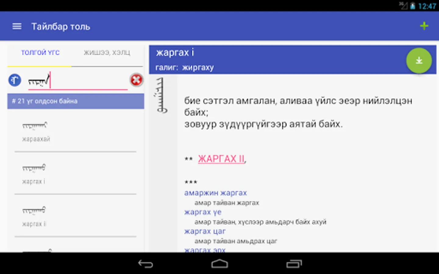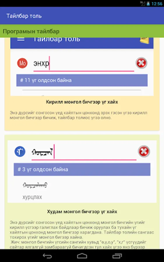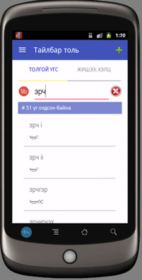 This is Dictionary of Mongolian old script writing words and modern Mongolian alphabetic writing. User can search words in modern script and find out how it is written in old script, and vise versa search in old script to get words how will be in modern script. Dedicated for all who is learning old vertical script.