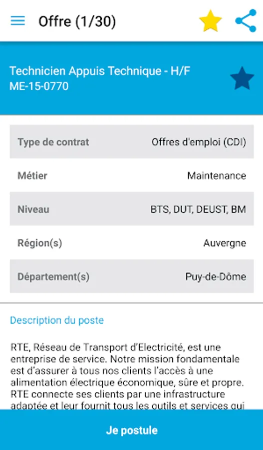 A search engine of offers is available to the user who can select the offers that interest you, mark favorites for future reference, or to apply directly from the application. To apply, simply create an account from within the application (or from the website of RTE www.rte-france.com) or use an existing account. It is especially possible to pass on his CV and cover letter from their smartphone.