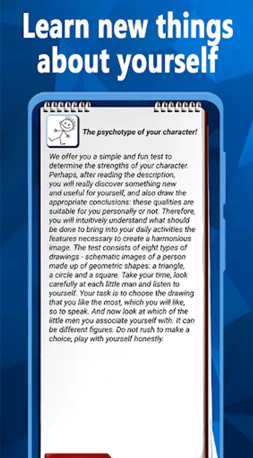 Take a look at the application and find out your character strengths, what kind of person you are in love, your relationships at work and with people around you. More than 20 unique free tests are presented to your attention. Here are the most interesting and free psychological tests: