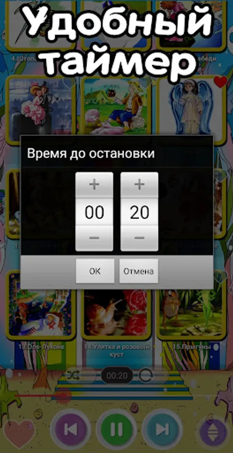 👉 convenient rifles for listening to audio fairy tales for children 🎶: random selection (a new fairy tale after a fairy tale is played) and a constant repeat of the fairy tale for children;