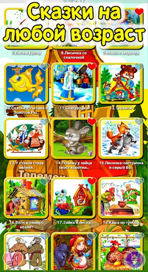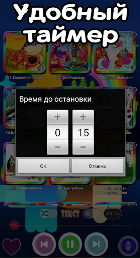 - convenient listening modes: random selection and repetition of a fairy tale;