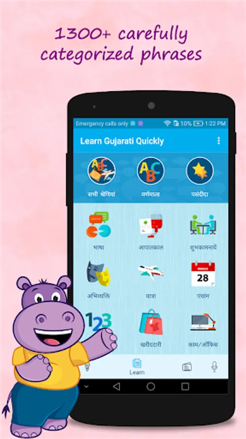 If you are determined to learn a specific category of words, Learn Gujarati Quickly will enable you that. It provides Gujarati translation for most frequently used words and phrases across 33 categories. You can use it like an English to Gujarati dictionary for 1300+ Gujarati words and Gujarati phrases. It’s indeed a great handy tool that will get you talking conversational language fast.