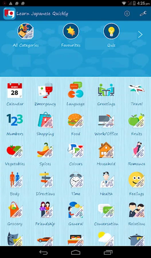 If you are determined to learn in Japanese a specific category of words, Learn Japanese Quickly will enable you that. It provides Japanese translation for most frequently used words and phrases across 33 categories. You can use it like an English to Japanese dictionary for 1100+ Japanese words and Japanese phrases. It’s indeed a great handy tool that will get you talking conversational language fast.