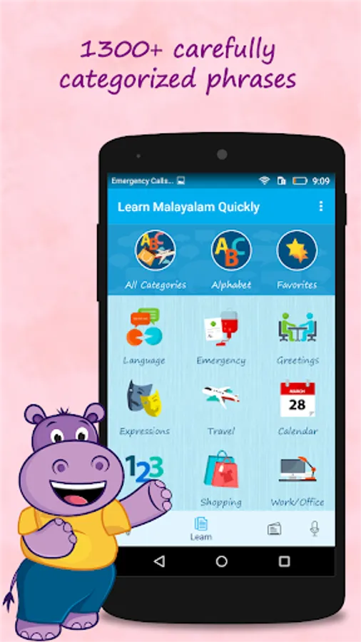 If you are determined to learn a specific category of words, Learn Malayalam Quickly will enable you that. It provides Malayalam translation for most frequently used words and phrases across 33 categories. You can use it like an English to Malayalam dictionary for 1100+ Malayalam words and Malayalam phrases. It’s indeed a great handy tool that will get you talking conversational language fast.