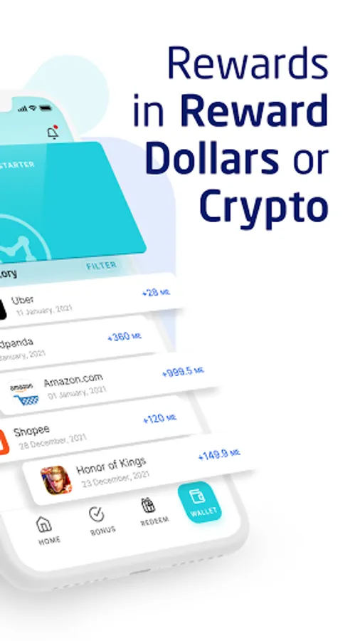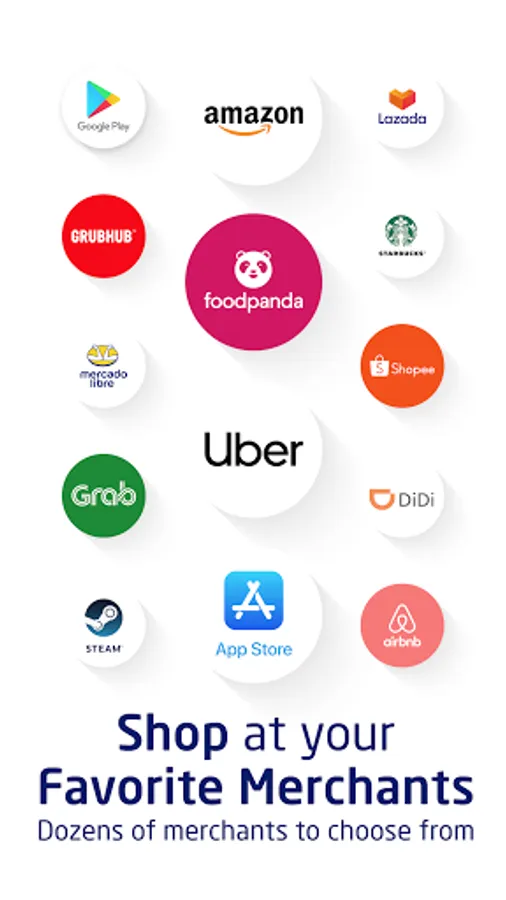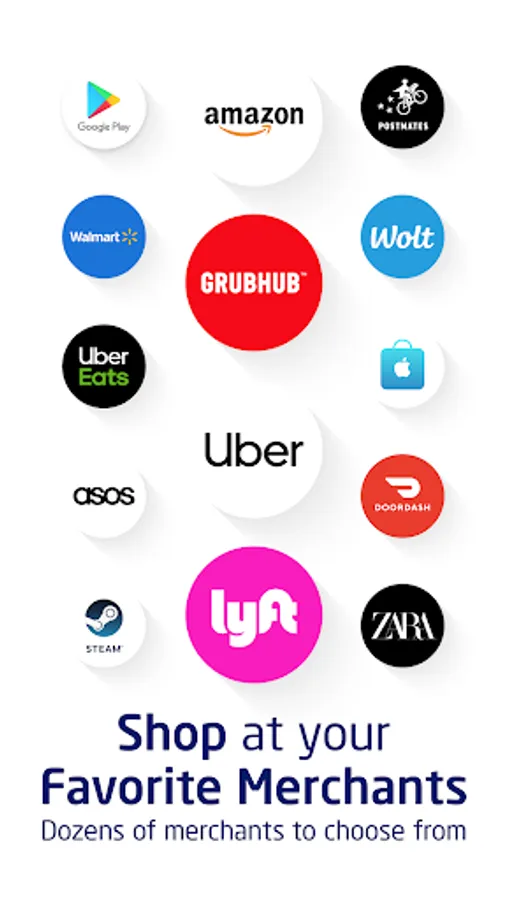 Earn Up to Extra 10% rewards on 100+ Merchants! Supporting brands include Amazon, Walmart, Mercado Libra, Shopee, Lazada, Foodpanda, Deliveroo, Doordash, App Store, Google Play, Go-Jek, 99, Cabify, Olacabs, Lyft, Grab, Rappi, Uber, ZARA, ASOS … and more!