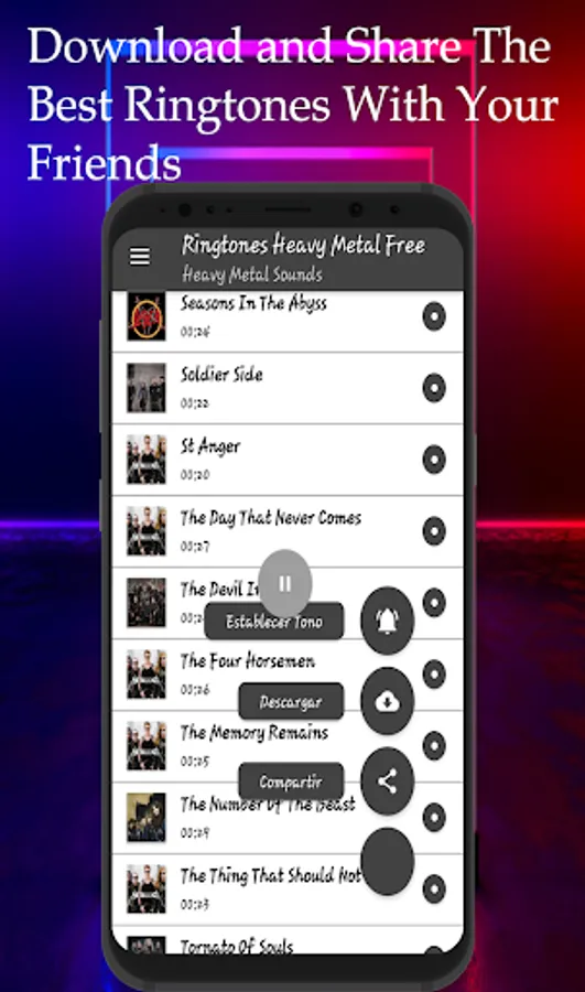 This application has a large collection of the best sounds and tones of Heavy Metal music hits for Android phones. All songs have been personally selected so you can download the best collection of Heavy Metal music ringtones and sounds for your phone, you can download the file in mp3, share the sounds on social networks or set your favorite song on your Android phone And you can set it as ringtone, SMS sound, alarm sound or notification sound; Remember that you will not be able to listen to the sounds offline, without an internet or wifi connection, since it is necessary to download the mp3 files.