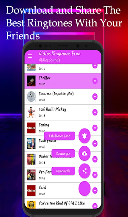 This application has a large collection of the best Oldies music hits sounds and tones for Android phones. All songs have been personally selected so you can download the best collection of Oldies music ringtones and sounds for your phone, you can download the mp3 file, share the sounds on social networks or set your favorite song on your Android phone and you can set it as ringtone, SMS sound, alarm sound or notification sound; Remember that you will not be able to listen to the sounds offline, without an internet or wifi connection, since it is necessary to download the mp3 files.