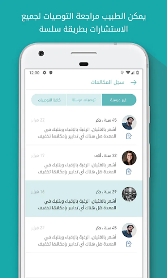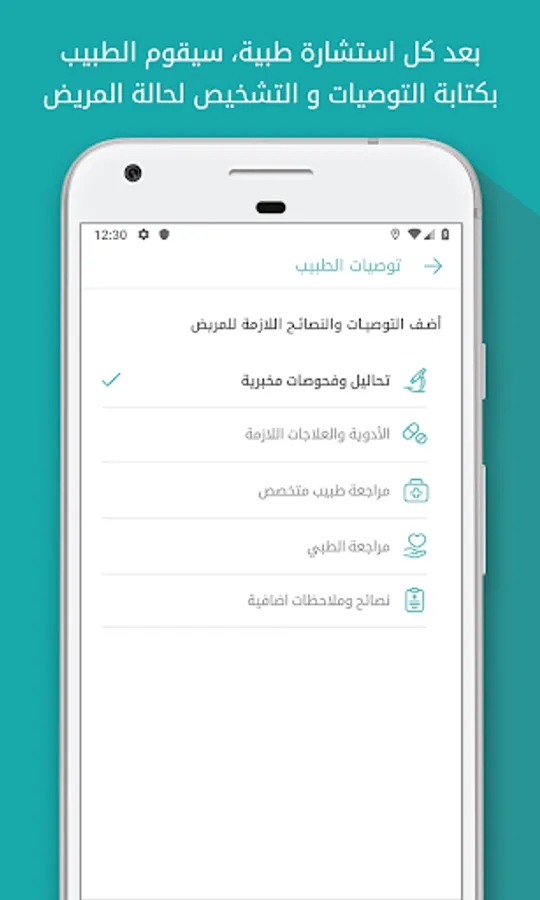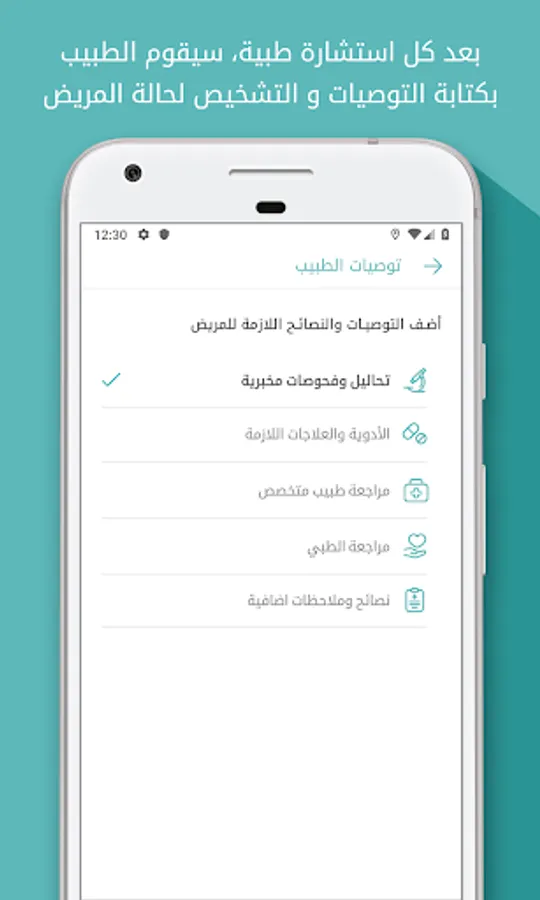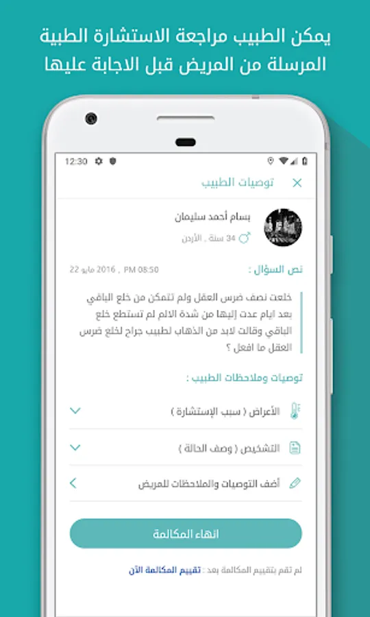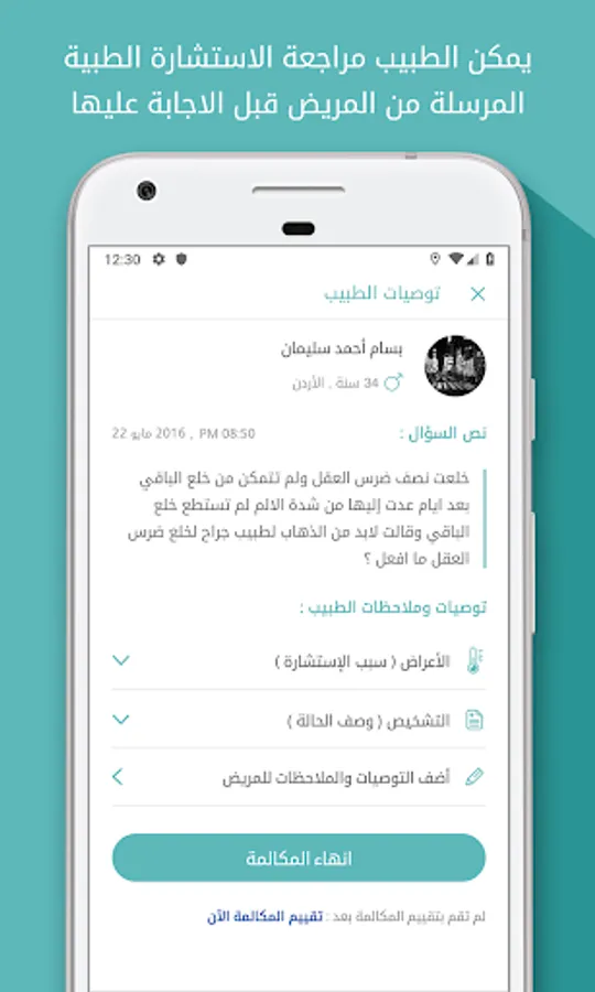 إرسال التوصيات الطبية للمريض بعد انتهاء الاستشارة.