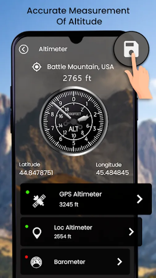 You must turn on location on your device to use this altimeter app for android. You have options in the altimeter barometer compass app to view the GPS altimeter or the barometric pressure of your position. This altimeter digital allows you to save the altitudes of different locations to access them later. With this altimeter GPS with barometer app, you will get the accurate altimeter of your position.