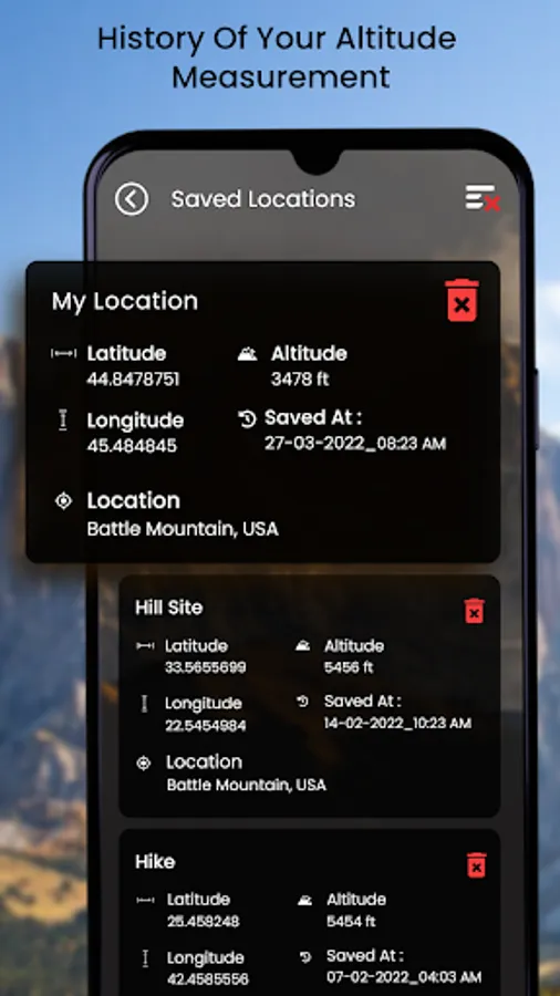 You can save the locations in the altimeter app for android with the GPS altimeter and barometric pressure readings. This altimeter GPS with barometer allows you to access and view the saved altitudes anytime. With this altimeter digital app, you can keep track of altitude wherever you go.