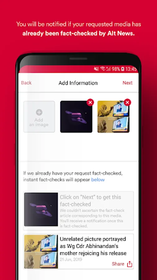 The app will allow you to look-up images and videos against the database of stories that have already been fact-checked by Alt News and get instant fact-checks. For images/videos that have not been fact-checked yet, you'll get notifications as and when they get fact-checked.