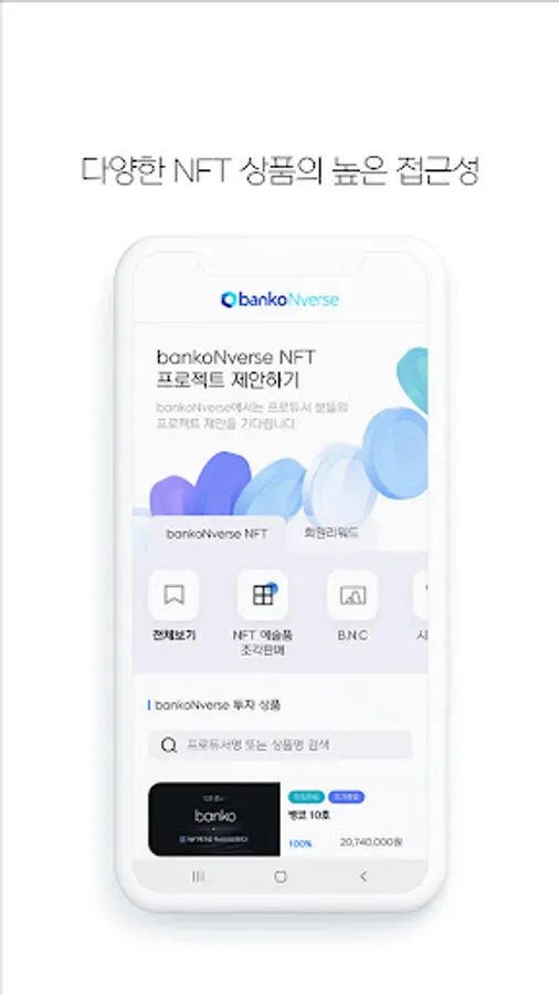 The main service product categories of bankoNverse are NFT, Online Investment Linkage Act, Venture Investment Promotion Act, reward-type funding, real estate piece investment, and metaverse product service.