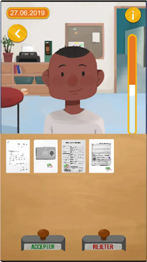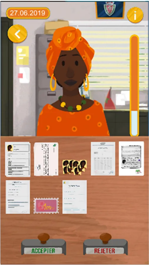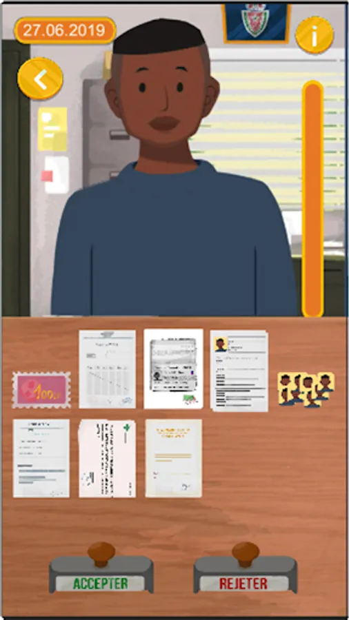 Ijra game est un jeu educatif dont l'objectif est de suivre le parcours des immigrants au Maroc. Vous incarnez un administrateur qui doit accepter ou refuser des documments délivrés par des immigrants, dans différents types de situation allant de l'arriver au Maroc, jusqu'a la demande de nationalité