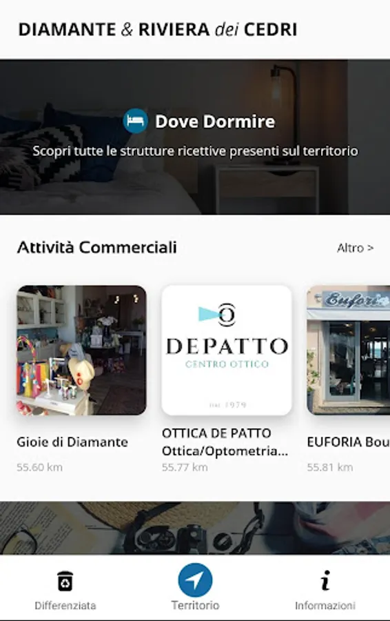 • Georeferenced homepage: suggests the commercial activities available nearby (hotels, restaurants, etc.), specifying for each information and detailed information.