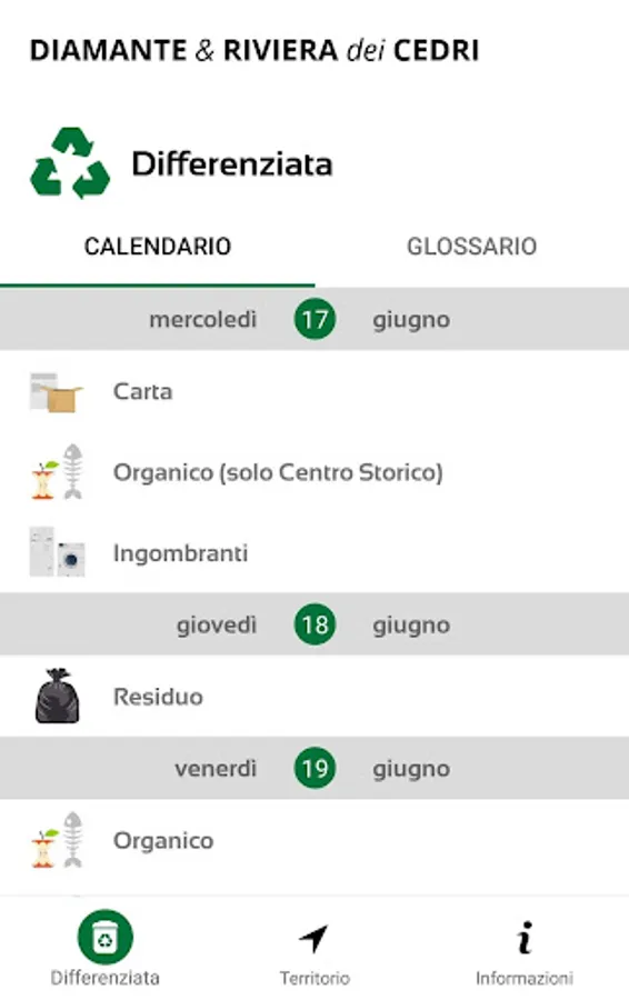 • Separate collection: section dedicated to the service and methods of separate collection of waste, with weekly calendar for the different types of waste.