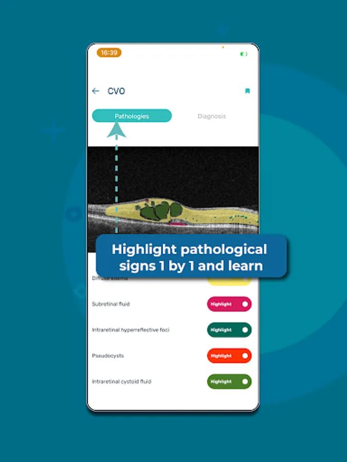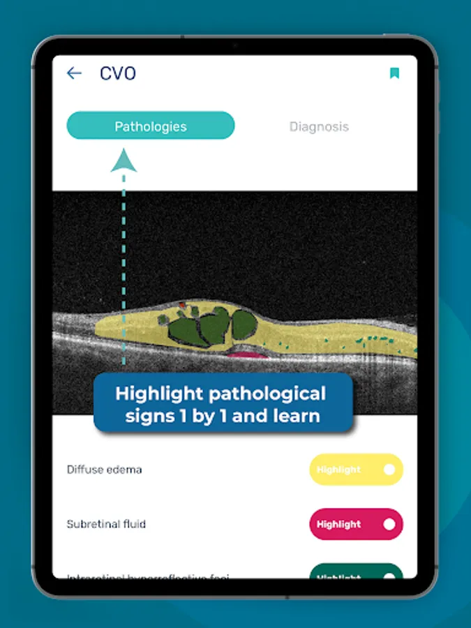 Interactive learning: Study OCT by highlighting pathological signs one by one and finding out the diagnosis. In the Altris ophthalmology OCT app, our retina experts add OCT cases of the most common retina pathologies, such as Wet/Dry AMD or Macular Degeneration as well as rare pathologies.