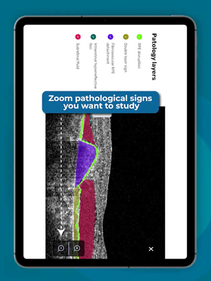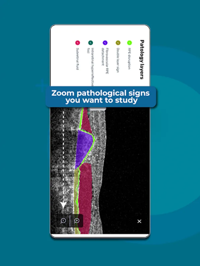 You can zoom any OCT scan to learn the details. In our ophthalmology OCT app, you can create your own library by selecting OCT scans from the feed or folders.
