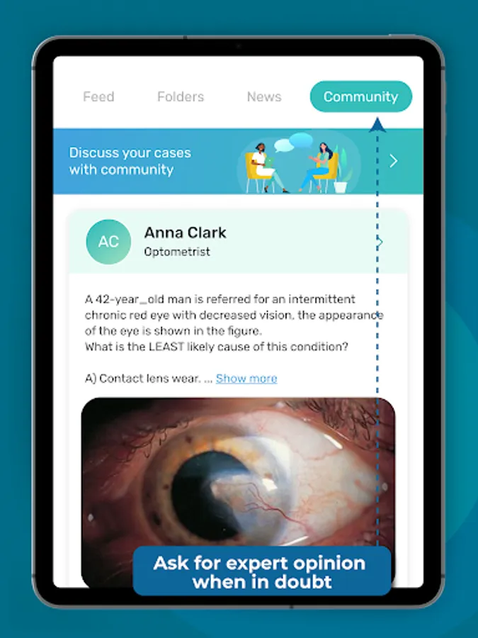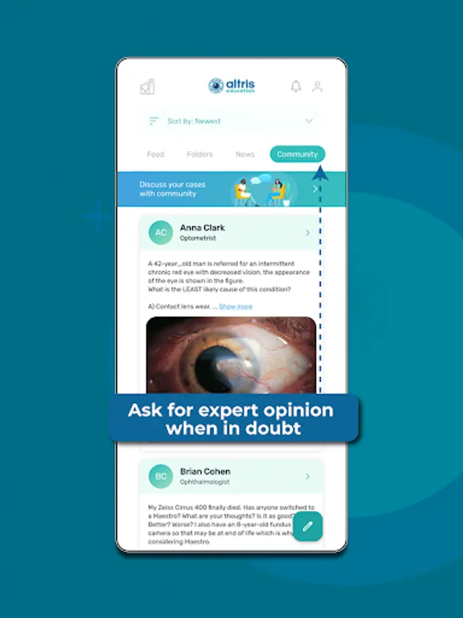 Community is the feature we are proud of. Join the optometry & ophthalmology OCT community directly in the app. Discuss problematic, controversial OCT scans with colleagues and experts to improve your decision-making.