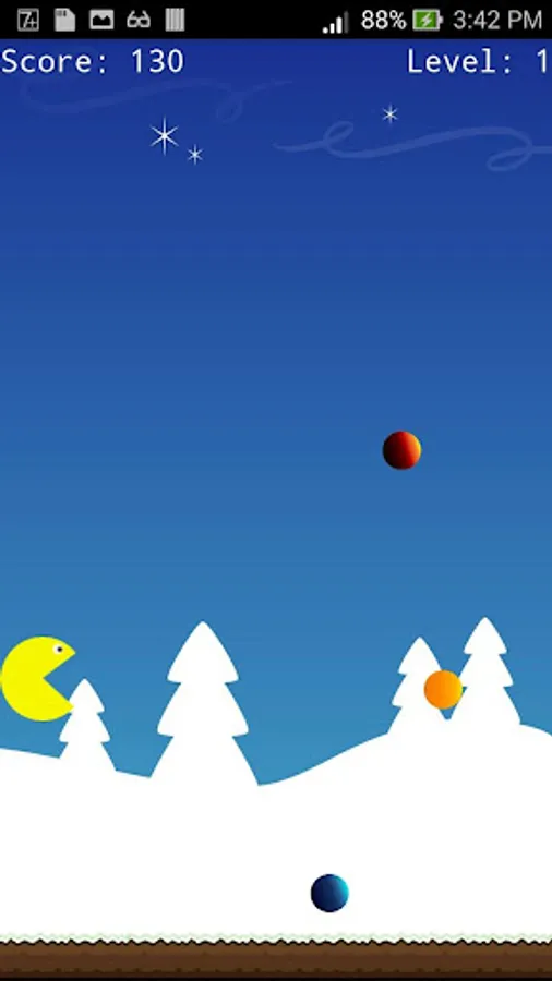 The game starts after you touch the screen. When you touch the screen with your finger, the character moves, and the only thing you have to do is to score points by eating colored balls. Do not forget to run away from the bomb.