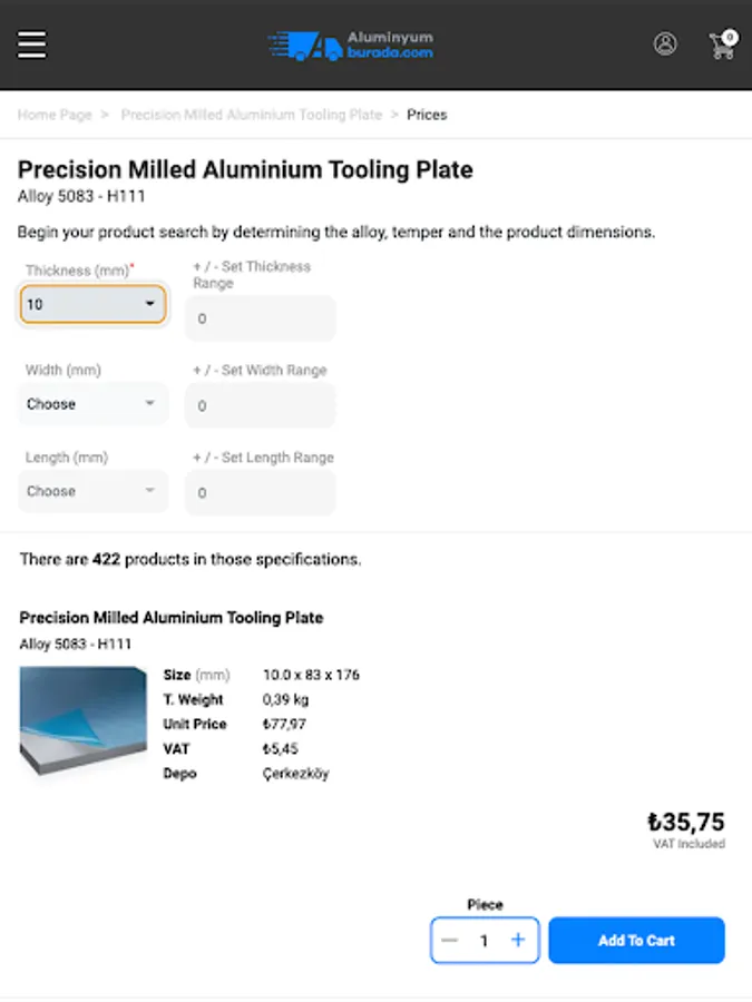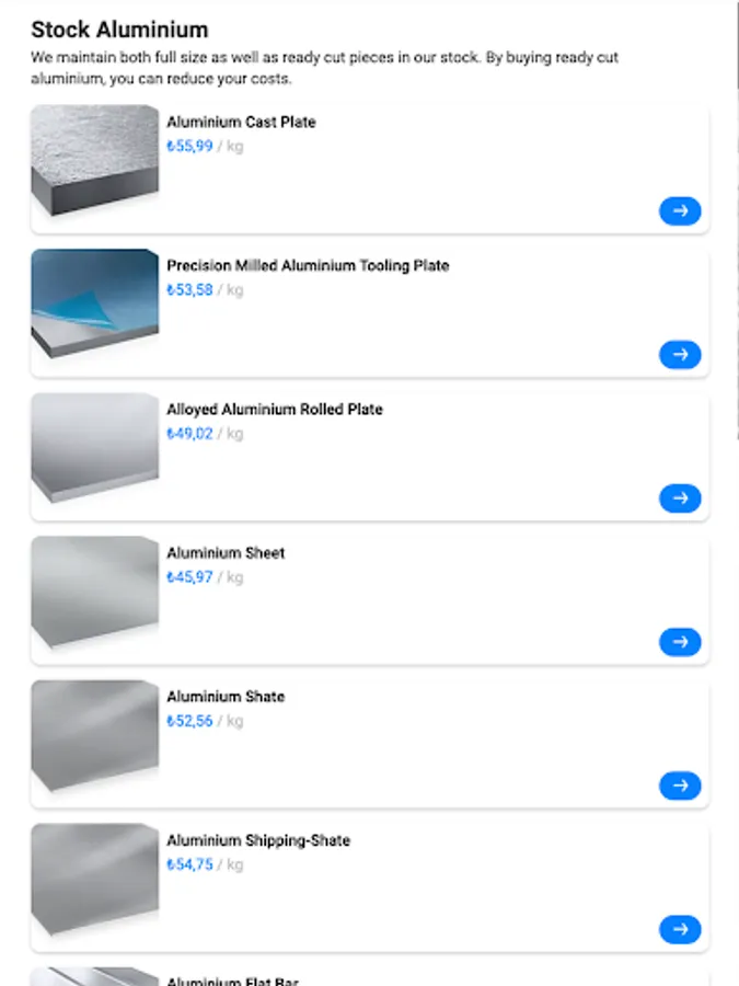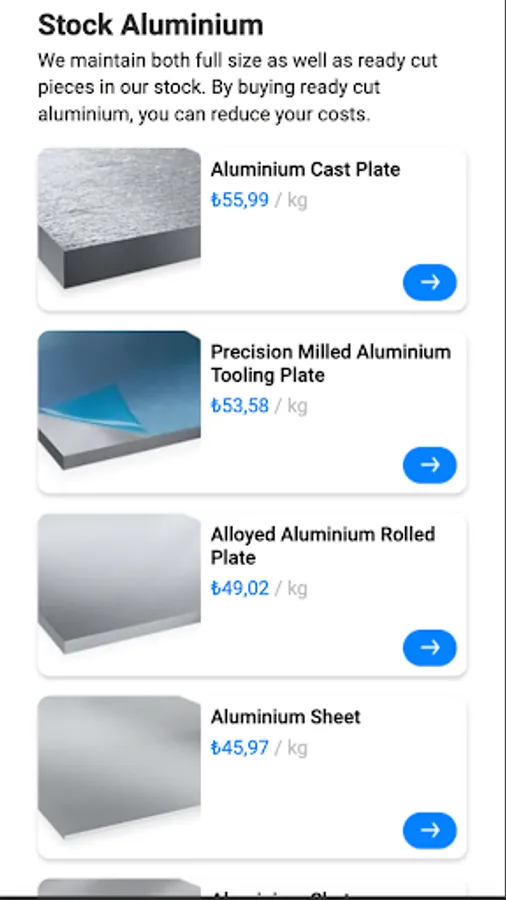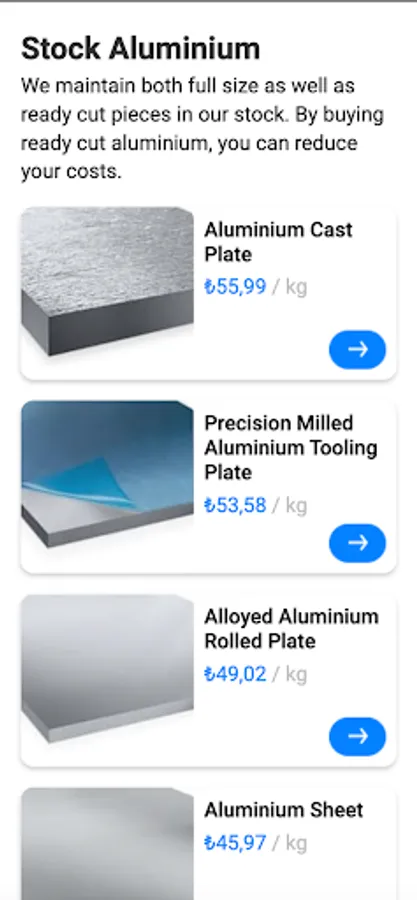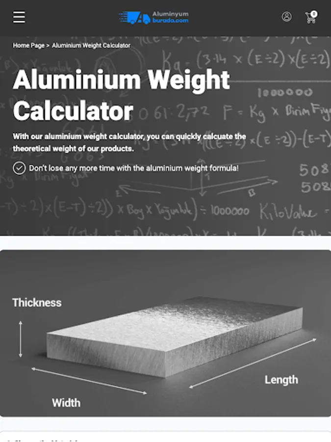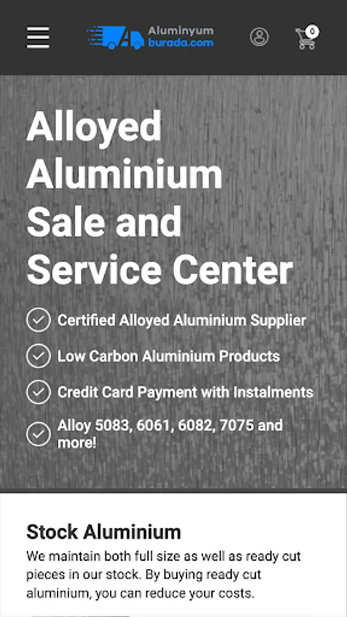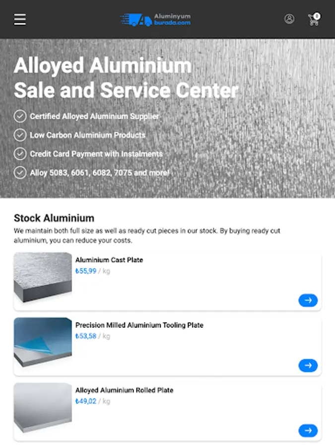 With the Aluminyumburada.com mobile app, you easily reach of our aluminium products from your mobile phone, browse their specifications and prices. You can either view our ready cut stock products or make a custom sizing request. You can use our aluminium weight calculator to find the weight of your products or view our blogs regarding information about aluminium.
